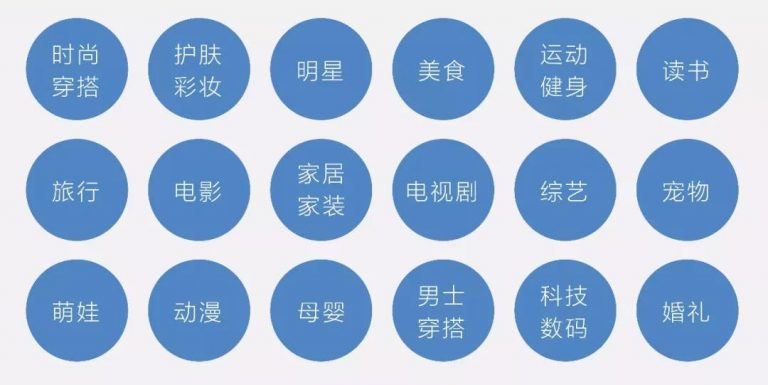 小紅書(shū)根據(jù)內(nèi)容定位延伸出來(lái)的主要內(nèi)容話(huà)題分為時(shí)尚穿搭、護(hù)膚彩妝、明星、美食、運(yùn)動(dòng)健身、讀書(shū)、旅行、電影、家居家裝、電視劇、綜藝、寵物、萌娃、動(dòng)漫、母嬰、男士穿搭、數(shù)碼科技、婚禮這18個(gè)方向。
